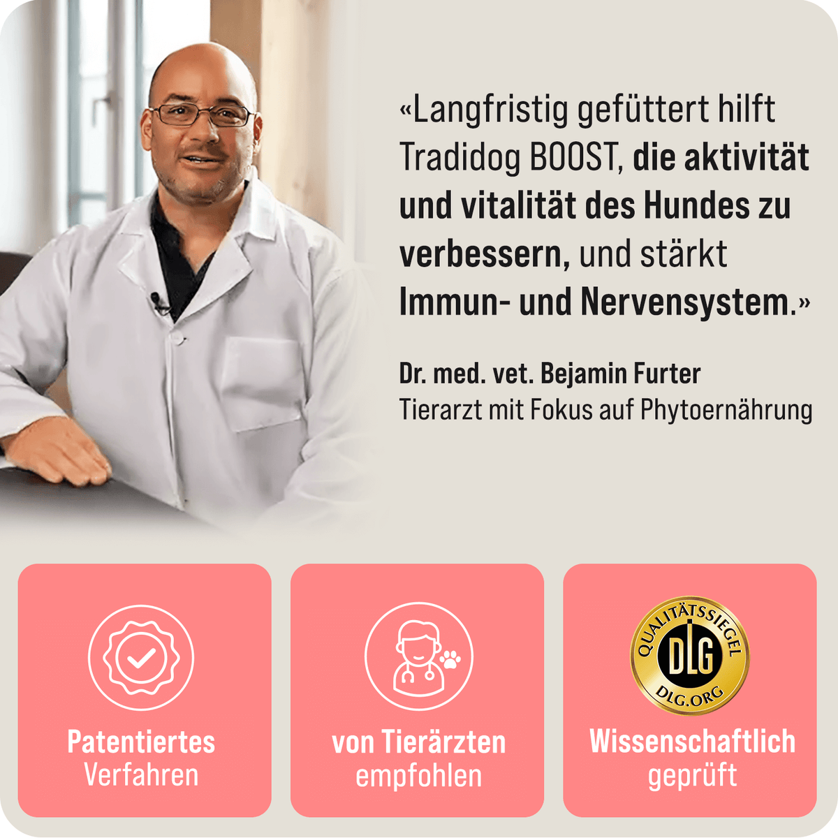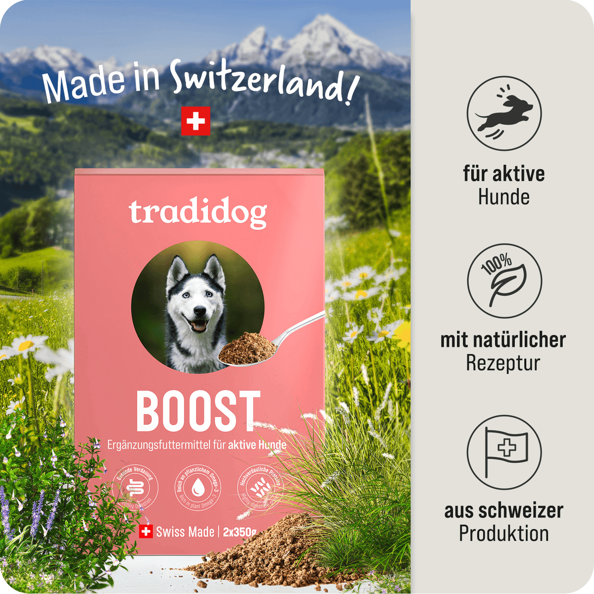 At Tradidog, your dog is our focus – every day, in every decision. We produce everything ourselves and exclusively in Switzerland, with the care and precision you expect from Swiss quality. Our ingredients are purely natural, come from controlled cultivation, and are processed in a way that preserves their full plant potency. Because we believe that what truly helps your dog comes from nature – and from genuine responsibility.