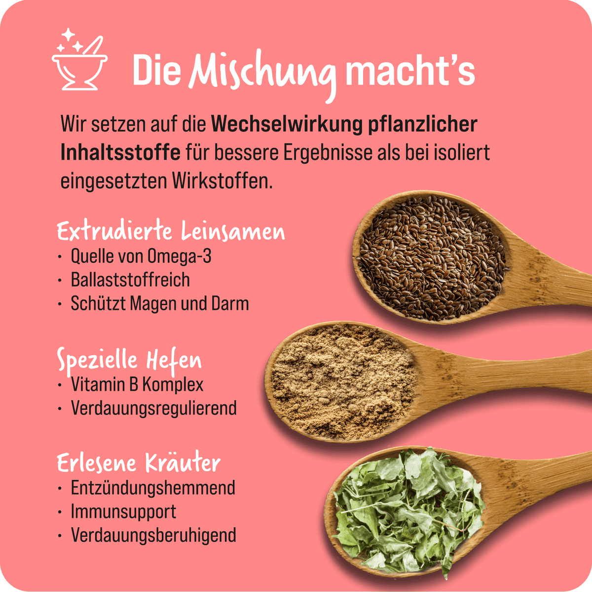 Omega-3 and the herbal blend activate fat metabolism and support energy production from food. Secondary plant substances such as flavonoids and saponins promote the utilization of nutrients – for greater vitality and balance.