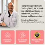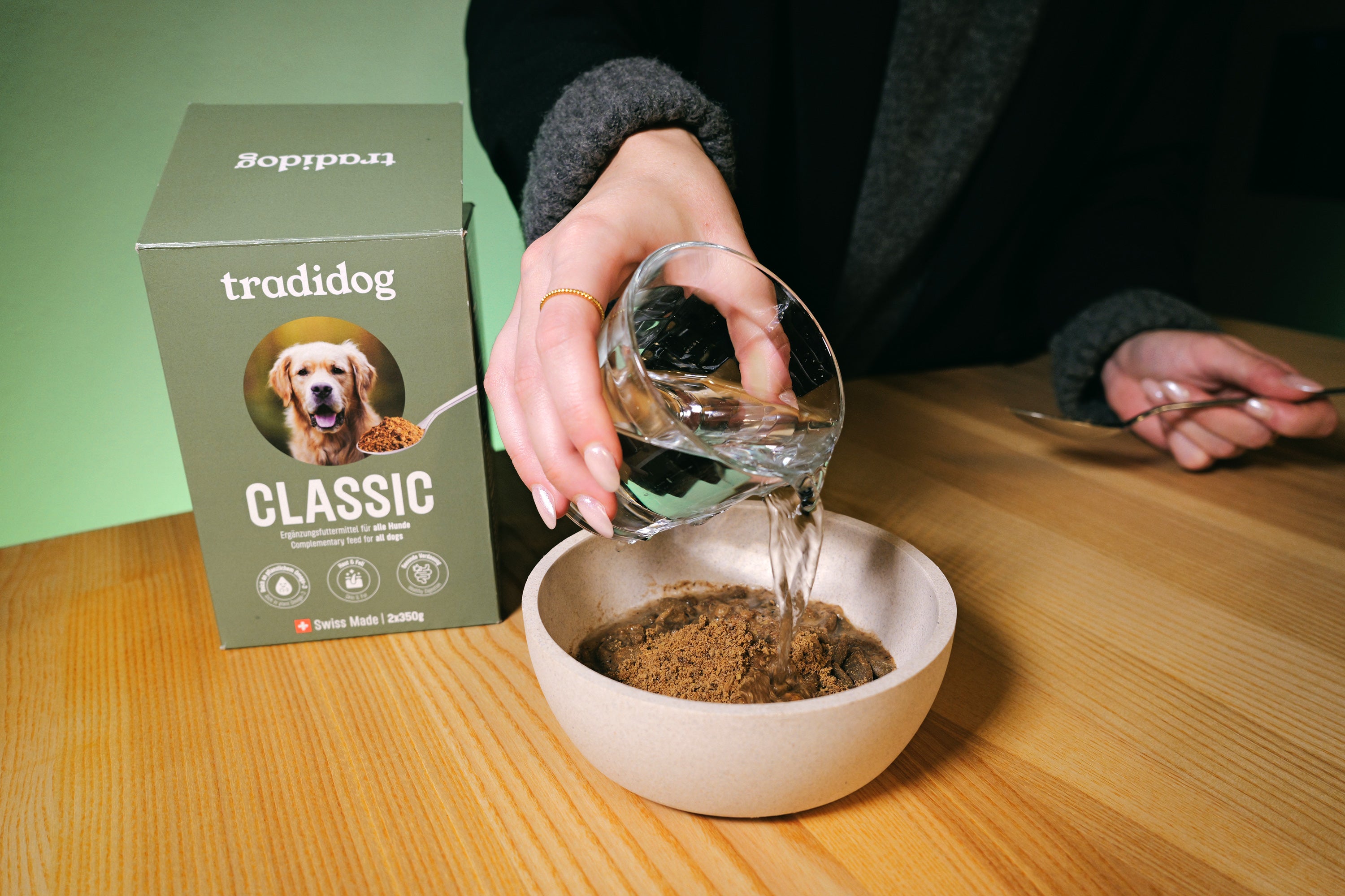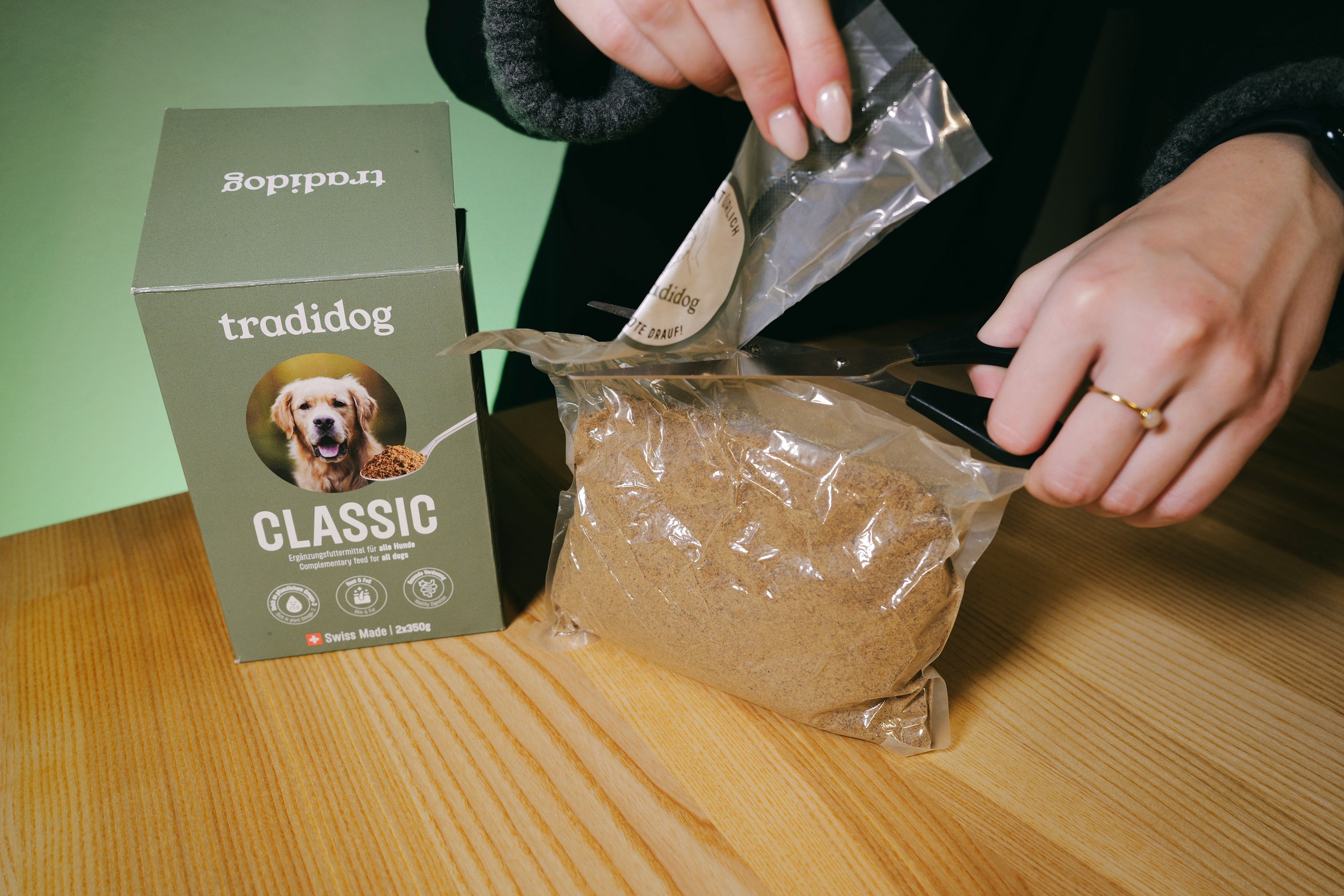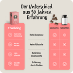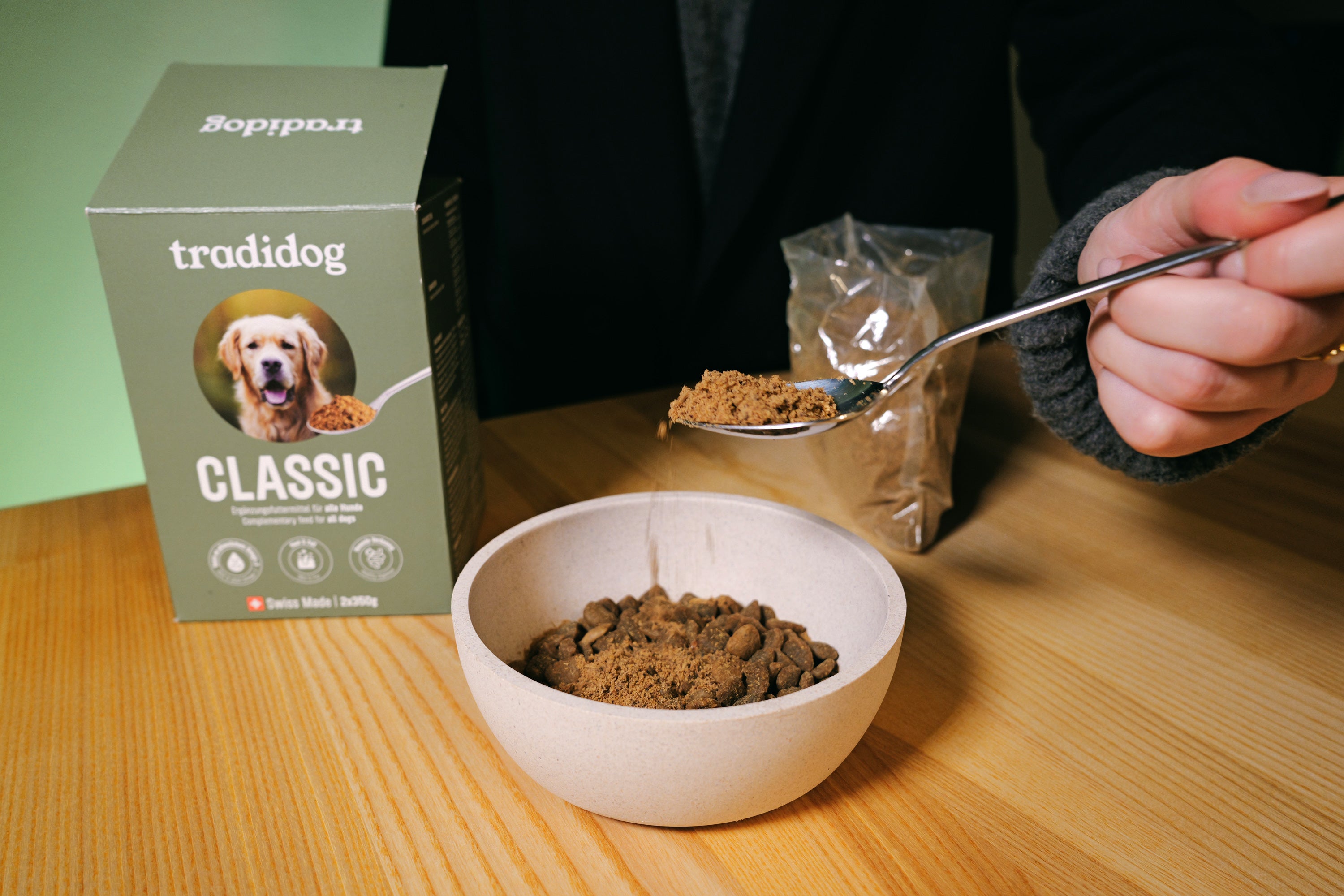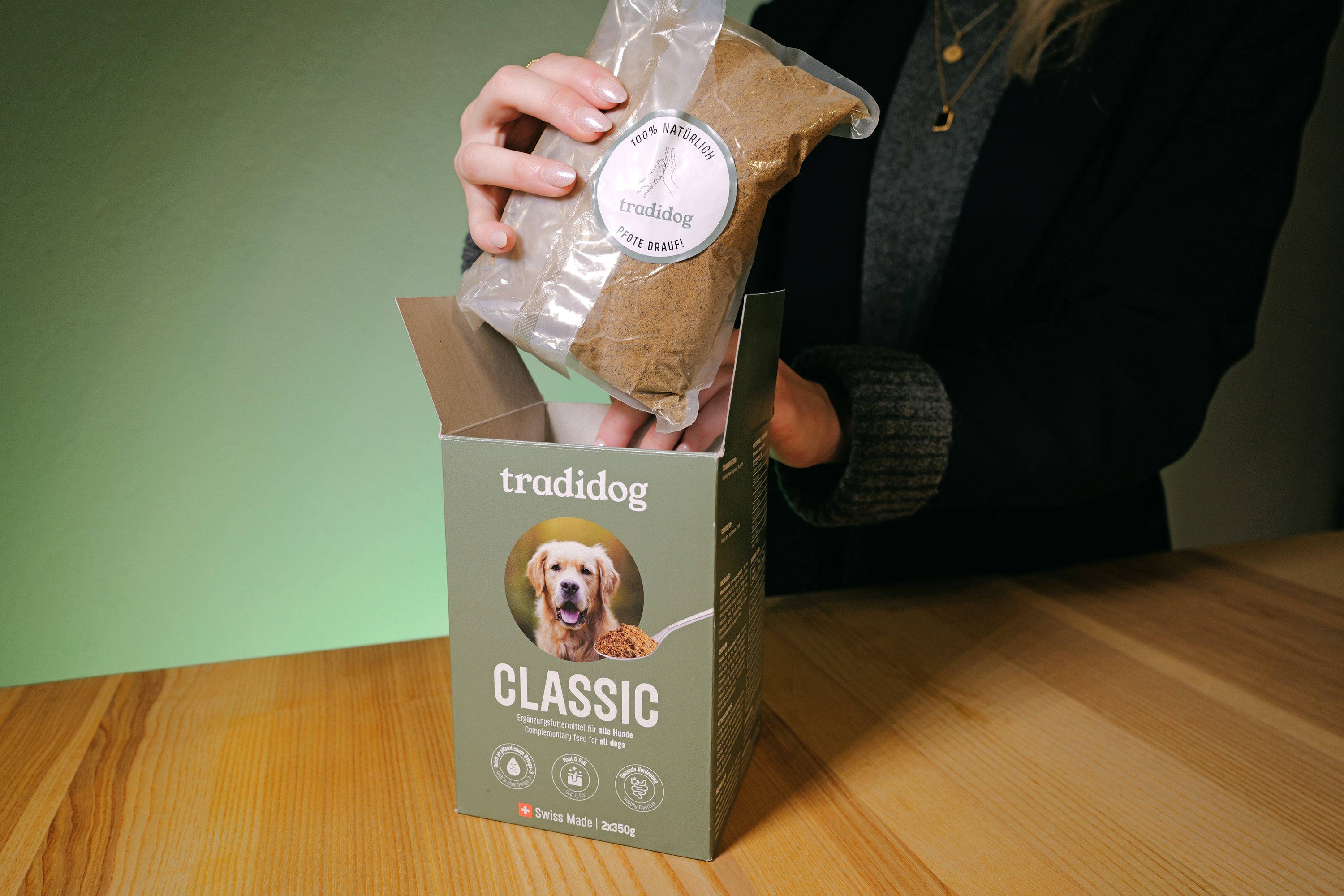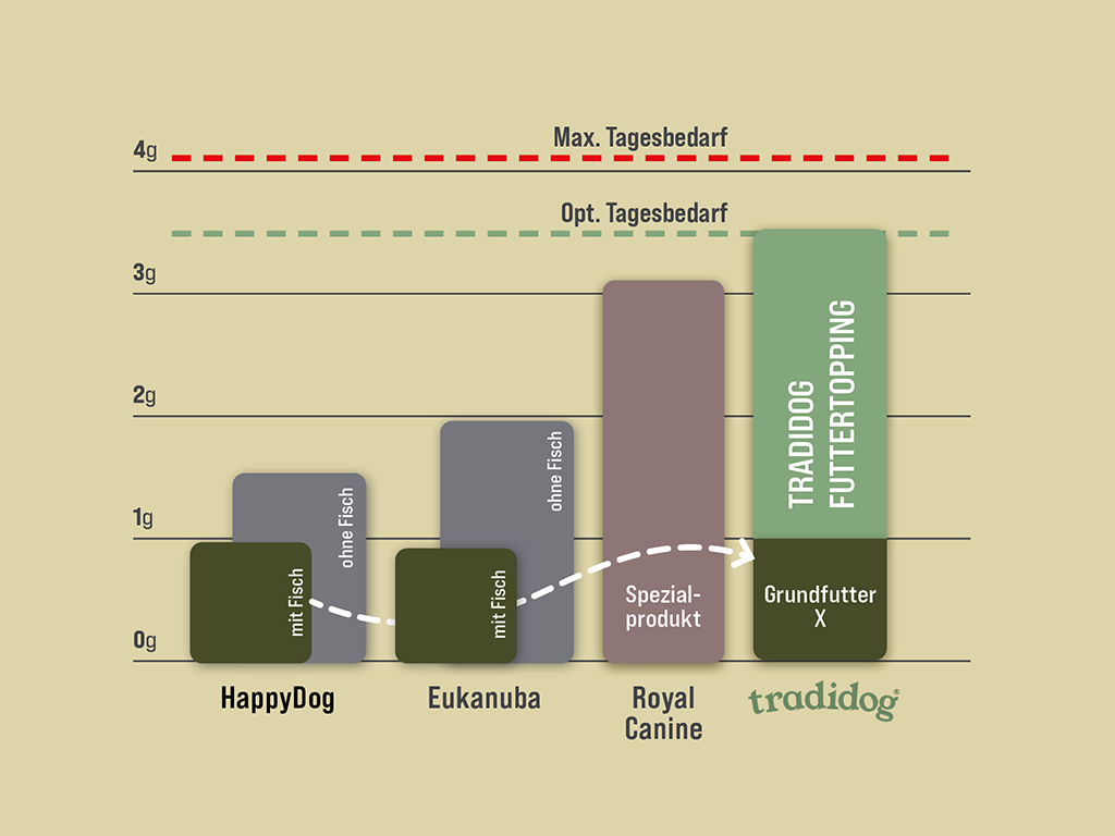 Most commercially available foods contain a maximum of 2g of omega-3 per daily portion, which is only about 50% of the recommended daily intake for medium-sized dogs. Tradidog's food topping, on the other hand, provides 2.46g of omega-3 per portion – optimally covering this requirement. This way, your dog is provided with a targeted supply of high-quality omega-3 fatty acids! Learn more
