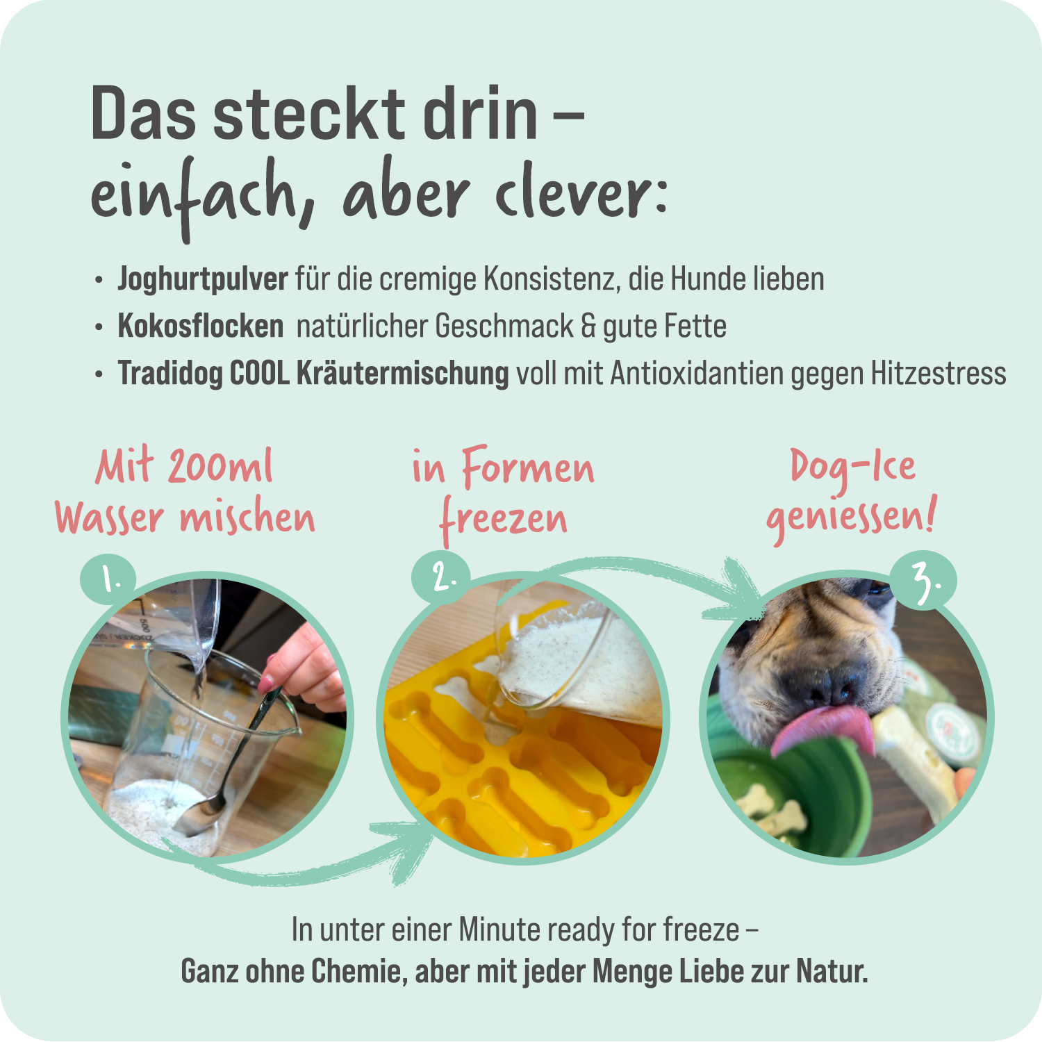 Most commercially available foods contain a maximum of 2g of omega-3 per daily portion, which is only about 50% of the recommended daily intake for medium-sized dogs. Tradidog's food topping, on the other hand, provides 2.46g of omega-3 per portion – optimally covering this requirement. This way, your dog is provided with a targeted supply of high-quality omega-3 fatty acids! Learn more